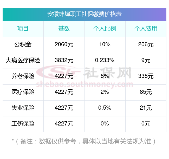 据新社通app显示,安徽蚌埠社保缴费基数2025年标准,(社保最低一个月要交多少钱)安徽蚌埠社保费用如下: