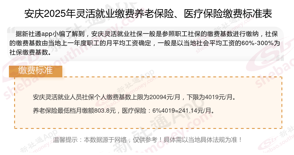 2025年安庆灵活就业人员社保需要交多少钱?社保缴费的金额取决于多个因素,包括缴费基数和缴费比例,且各地标准存在差异。下面随新社通小编一起来看看。