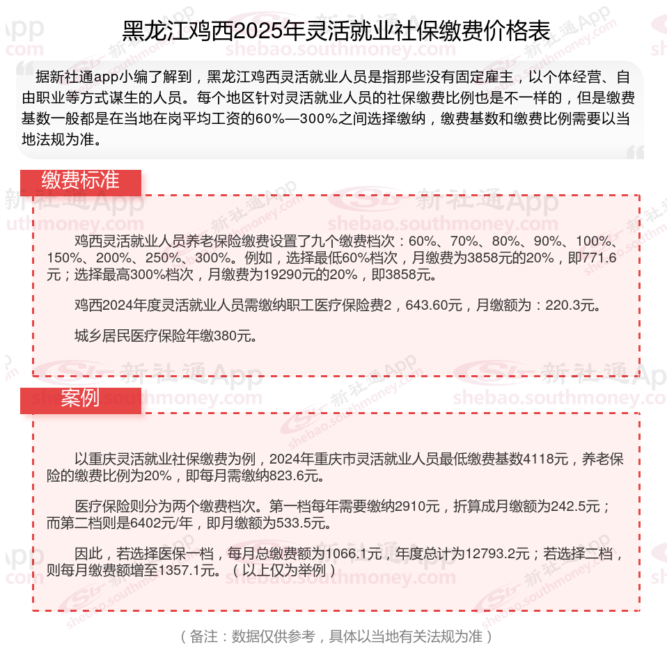 一、2024年黑龙江鸡西灵活就业社保缴费标准表 黑龙江鸡西灵活就业社保多少钱一个月?