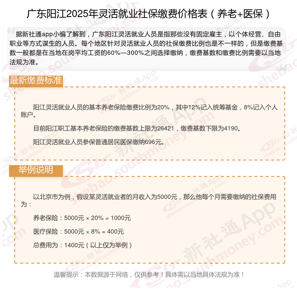 灵活就业社保缴费比例是多少?养老保险一般为缴费基数的20%左右,其中8%计入个人账户,12%计入统筹账户。医疗保险一般为缴费基数的10%左右,具体比例因地区而异。失业保险、工伤保险、生育保险缴费比例较低,具体比例因地区而异。接下来随社保君了解一下2025年广东阳江灵活就业人员社保交多少钱,2025年广东阳江灵活就业社保缴费标准的详细内容。