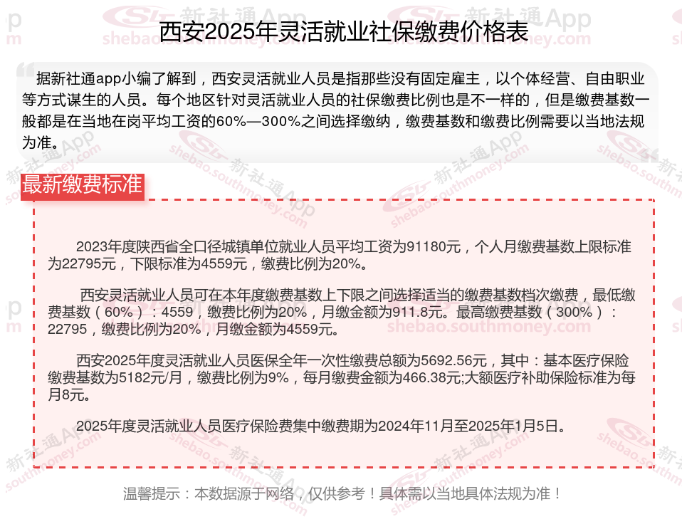 灵活就业社保能抵御疾病、失业、养老等重大风险,避免陷入经济困境。也能享受医保报销、养老金增长等红利。社保是劳动者的法定权利,断缴可能影响购房、落户、子女教育等。接下来随社保君了解一下2025年西安灵活就业人员社保交多少钱,2025年西安灵活就业社保缴费标准的详细内容。