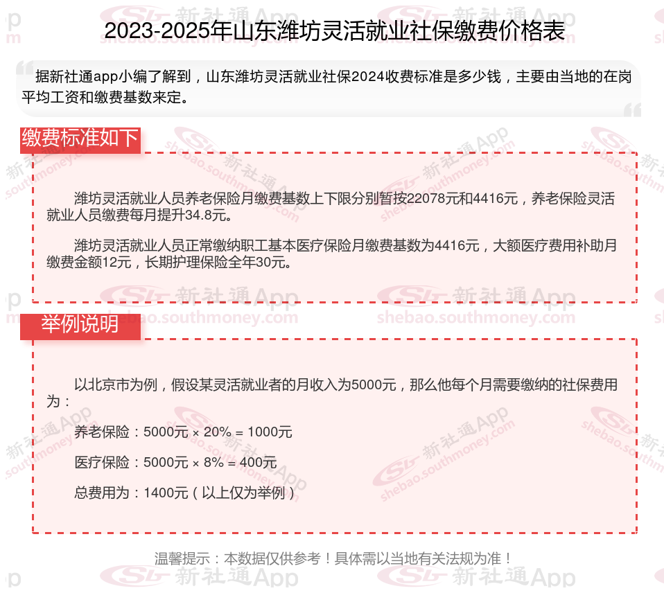 山东潍坊灵活就业社保2025年收费标准是多少钱,主要由当地的在岗平均工资和缴费基数来定。其次,灵活就业社保缴纳跟职工缴纳不同的地方在于,灵活就业社保参保只能参保养老保险和医疗保险,且缴纳比例完全由个人承担。另外,灵活就业人员社保参保选择,可自由选择参保城镇职工社保和城乡居民保险。2025年山东潍坊灵活就业社保缴多少钱?如何缴纳?怎么计算待遇?新社通APP小编将在下文为您详细说明。