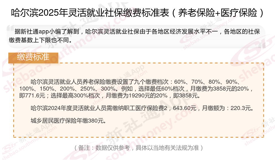 随着经济社会的不断发展,灵活就业群体日益壮大,其社保缴费问题也愈发受到关注。接下来随社保君了解一下2025年哈尔滨灵活就业人员社保交多少钱的详细内容。