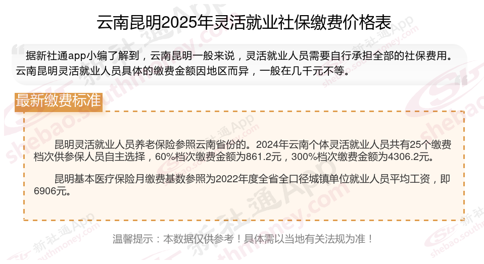 二、云南昆明2025年灵活就业社保缴费基数及比例最新消息