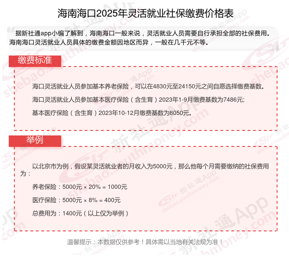 2025年海南海口灵活就业人员社保需要交多少钱?2025灵活就业社保缴费标准的调整,既体现了法规的连续性,又适应了经济社会发展的要求。灵活就业人员应根据自身情况,合理选择缴费基数和缴费比例,确保自身权益得到充分保证。接下来随新社通APP小编一起来看看。