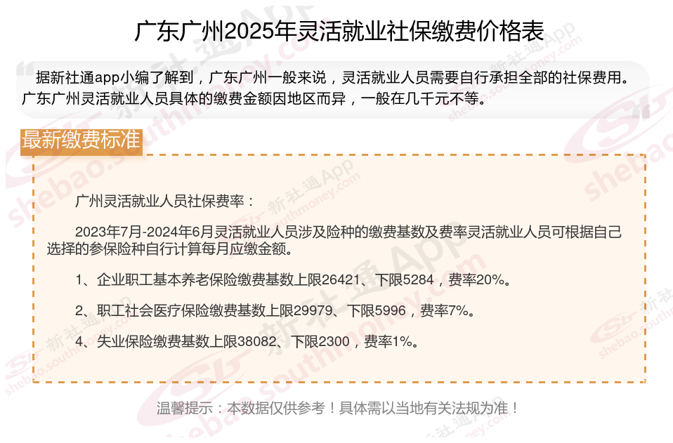 随着经济社会的不断发展,灵活就业群体不断地日益壮大,其社保缴费问题也愈发受到关注。那么2025年广东广州灵活就业人员社保交多少钱,你了解2025年广东广州灵活就业人员社保缴费基数及比例吗,接下来随新社通APP小编一起来看看。