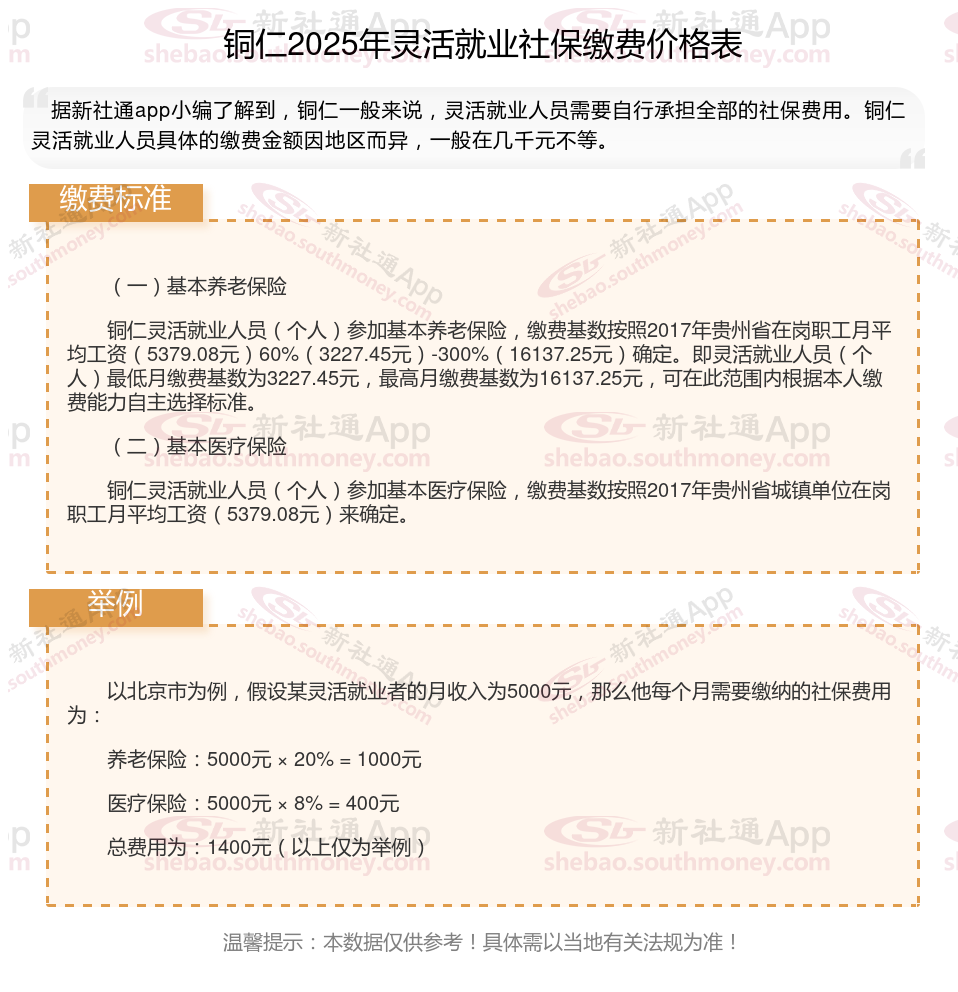 灵活就业社保缴费比例是多少?养老保险一般为缴费基数的20%左右,其中8%计入个人账户,12%计入统筹账户。医疗保险一般为缴费基数的10%左右,具体比例因地区而异。失业保险、工伤保险、生育保险缴费比例较低,具体比例因地区而异。接下来随社保君了解一下2025年铜仁灵活就业人员社保交多少钱,2025年铜仁灵活就业社保缴费标准的详细内容。