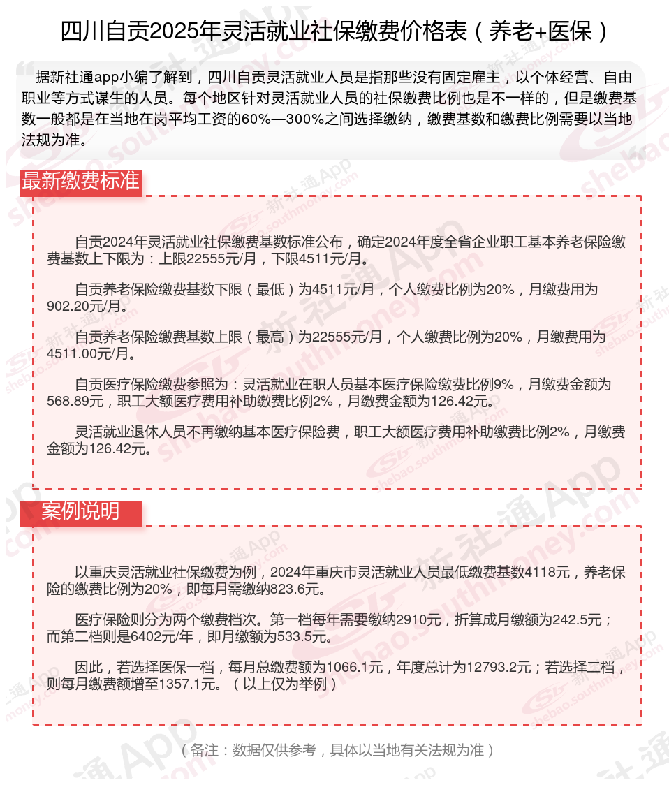 灵活就业社保通常只需缴纳养老和医疗两项(部分地区可自愿选缴失业险),其他险种无需强制缴纳。灵活就业社保缴费满15年后,退休后可领取养老金,避免老年无收入来源。那么2025年四川自贡灵活就业人员社保需要交多少钱?下面随新社通小编一起来看看。