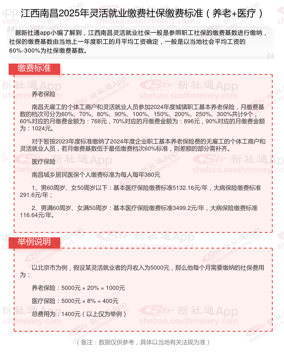 2025年江西南昌灵活就业人员社保需要交多少钱?灵活就业社保通常只需缴纳养老和医疗两项(部分地区可自愿选缴失业险),其他险种无需强制缴纳。灵活就业社保缴费满15年后,退休后可领取养老金,避免老年无收入来源。接下来随新社通APP小编一起来看看江西南昌灵活就业人员社保缴费的内容。