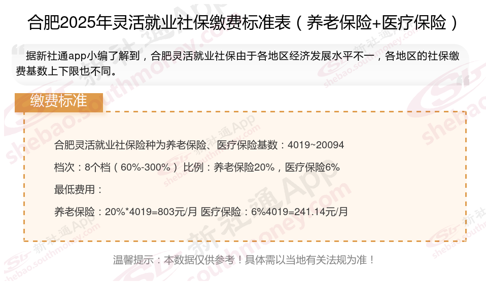 2025年合肥灵活就业人员社保交多少钱,你了解2025年合肥灵活就业人员社保缴费基数及比例吗,据新社通小编了解到,灵活就业社保缴费标准每年都会有所调整,主要体现在缴费基数和缴费比例上。接下来随新社通APP小编一起来看看。