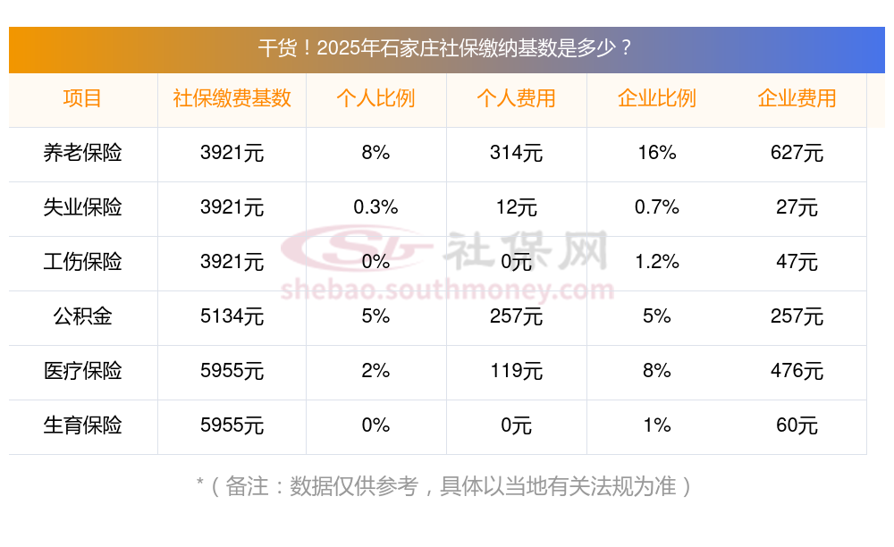 一、石家庄社保缴费标准基数及比例新消息,2025年石家庄职工社保缴费基数是多少钱一个月?
