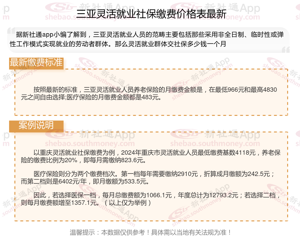 社保能抵御疾病、失业、养老等重大风险,避免陷入经济困境。也能享受医保报销、养老金增长等红利。社保是劳动者的法定权利,断缴可能影响购房、落户、子女教育等。那么2025年三亚灵活就业人员社保需要交多少钱?灵活就业人员社保缴费标准是多少?下面随新社通小编一起来看看。