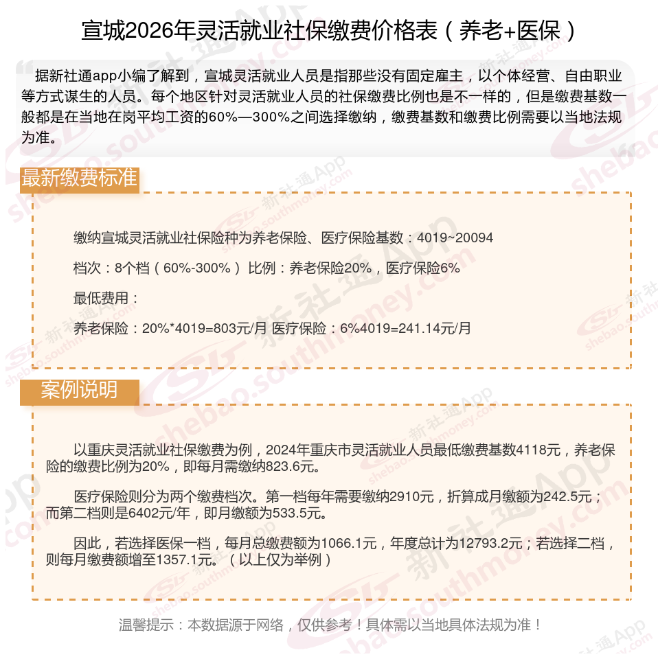 一、2026年宣城灵活就业社保缴费标准表 2026年宣城灵活就业社保多少钱一个月?