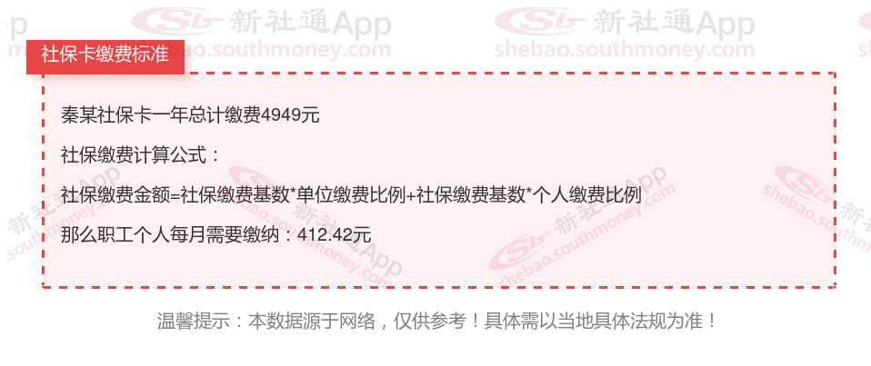 由上图得知,秦某社保卡一年需要缴纳4949元,职工个人月缴纳412.42元,若您想要了解明细点击新社通社保计算器,来了解一下明细吧。