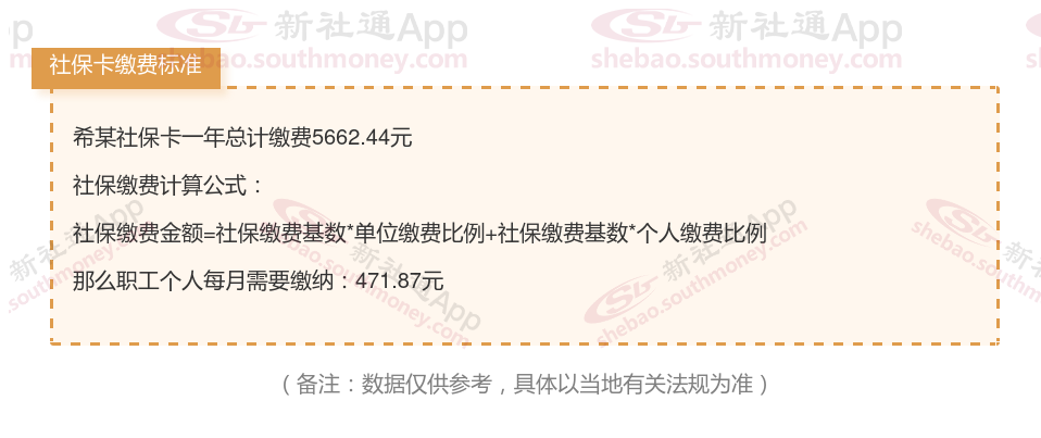 由上图得知,希某社保卡一年需要缴纳5662.44元,职工个人月缴纳471.87元,若您想要了解明细点击新社通社保计算器,来了解一下明细吧。
