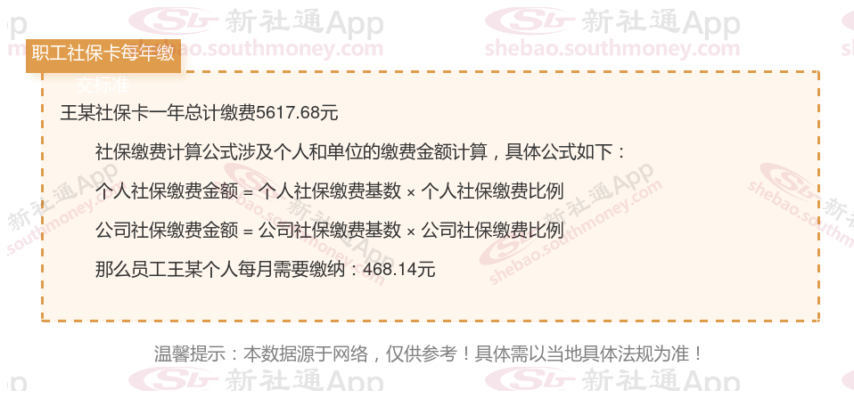 由上图得知,王某社保卡一年需要缴纳5617.68元,个人部分每月需要缴纳468.14元,若您想要了解明细点击新社通社保计算器,来了解一下明细吧。
