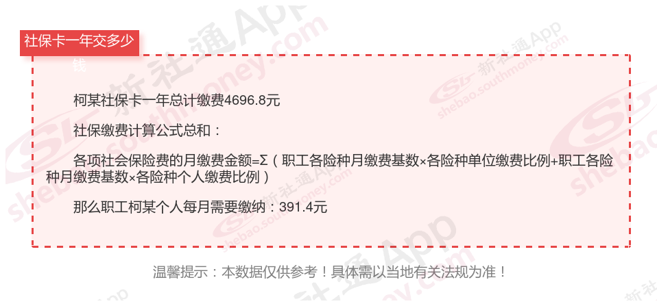 由上图得知,柯某社保卡一年需要缴纳4696.8元,职工个人月缴纳391.4元,若您想要了解明细点击新社通社保计算器,来了解一下明细吧。