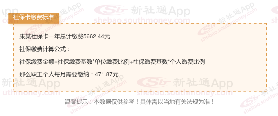 由上图得知,朱某社保卡一年需要缴纳5662.44元,职工个人月缴纳471.87元,若您想要了解明细点击新社通社保计算器,来了解一下明细吧。