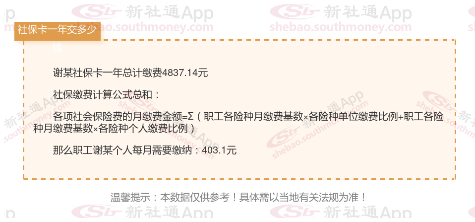 由上图得知,谢某社保卡一年需要缴纳4837.14元,职工个人月缴纳403.1元,若您想要了解明细点击新社通社保计算器,来了解一下明细吧。