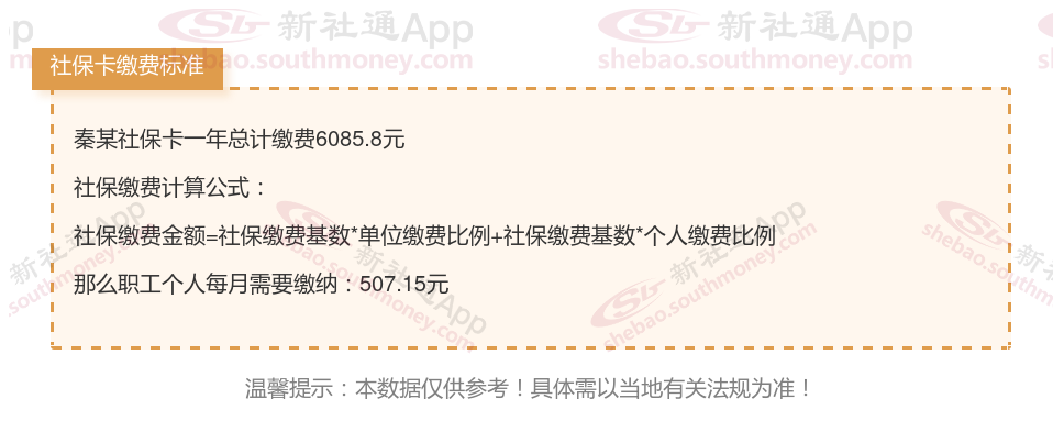 由上图得知,秦某社保卡一年需要缴纳6085.8元,个人部分每月需要缴纳507.15元,若您想要了解明细点击新社通社保计算器,来了解一下明细吧。