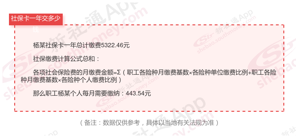 由上图得知,杨某社保卡一年需要缴纳5322.46元,职工个人月缴纳443.54元,若您想要了解明细点击新社通社保计算器,来了解一下明细吧。