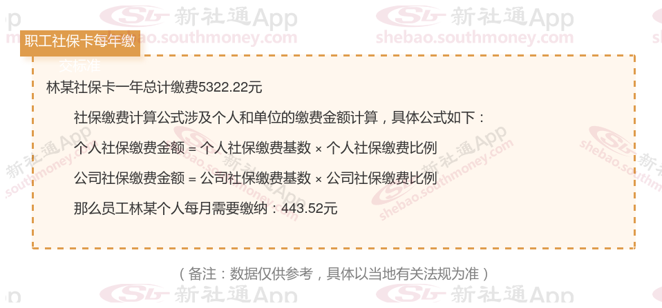 由上图得知,林某社保卡一年需要缴纳5322.22元,个人部分每月需要缴纳443.52元,若您想要了解明细点击新社通社保计算器,来了解一下明细吧。