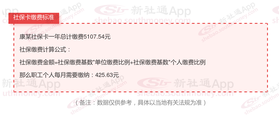 由上图得知,康某社保卡一年需要缴纳5107.54元,职工个人月缴纳425.63元,若您想要了解明细点击新社通社保计算器,来了解一下明细吧。