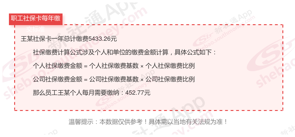 由上图得知,王某社保卡一年需要缴纳5433.26元,职工个人月缴纳452.77元,若您想要了解明细点击新社通社保计算器,来了解一下明细吧。
