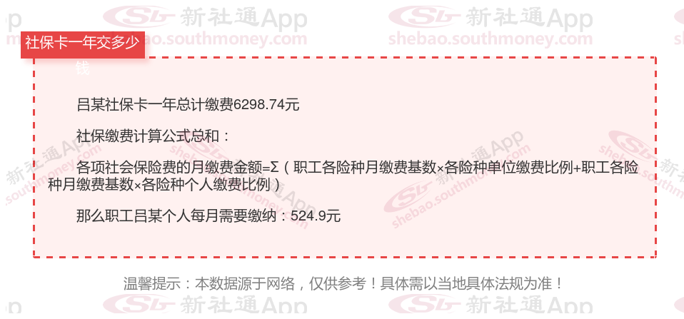 由上图得知,吕某社保卡一年需要缴纳6298.74元,个人部分每月需要缴纳524.9元,若您想要了解明细点击新社通社保计算器,来了解一下明细吧。