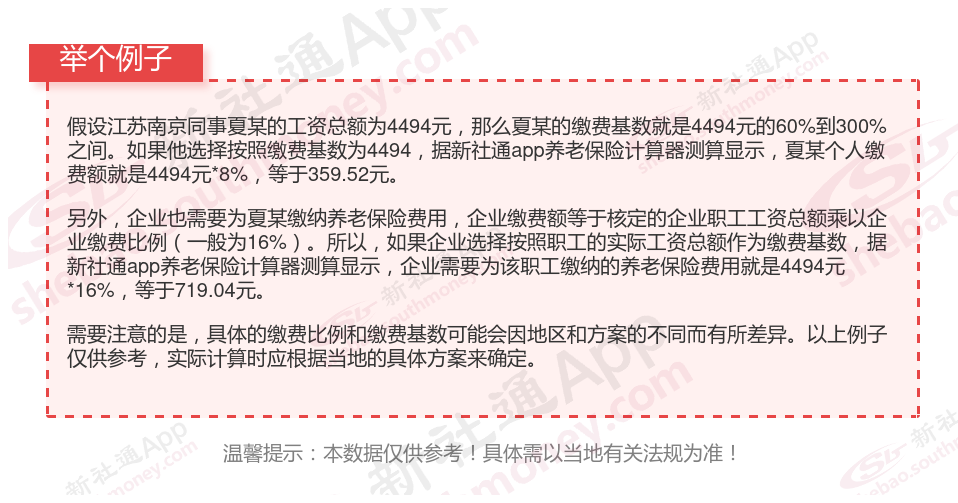 据新社通app显示,江苏南京职工养老保险最低缴费基数为:4494元;单位和个人的缴费比例分别为:16%、8%;