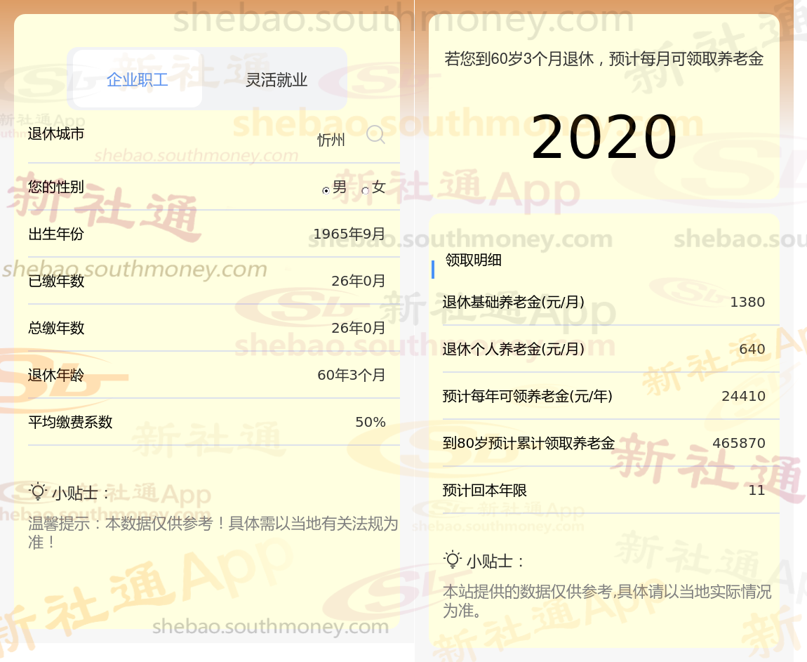 个人档案:男性,1965年出生,忻州退休职工,社保缴费26载,档次50%。