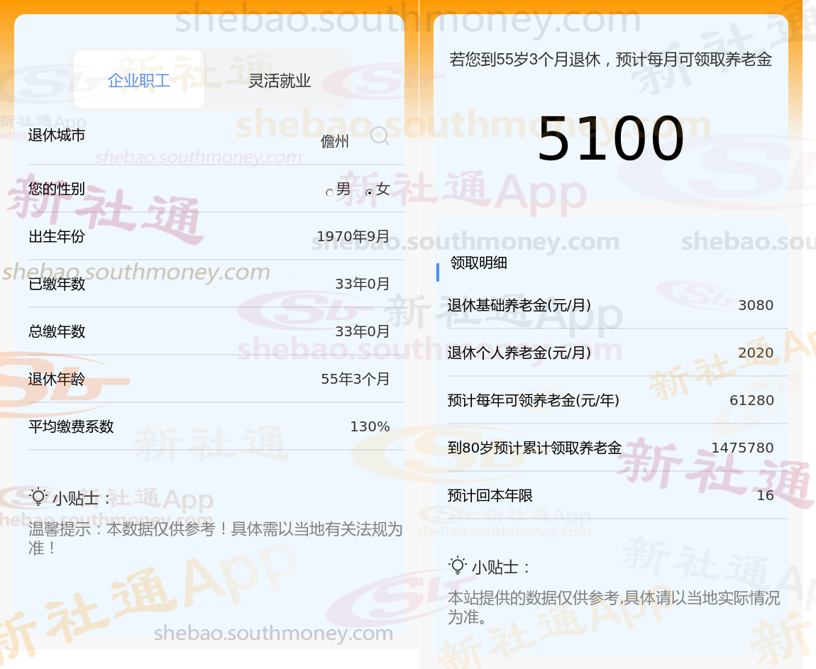 退休城市:海南儋州,性别:女,出生年份:1970,总缴年数33年,缴费档次:130%,新社通app养老金计算器所得: