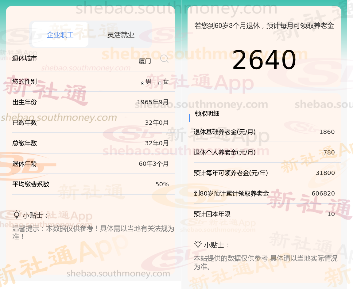 个人基础信息:男性,1965年出生,福建厦门退休人士,拥有32年的缴费年限,缴费档次为50%。
