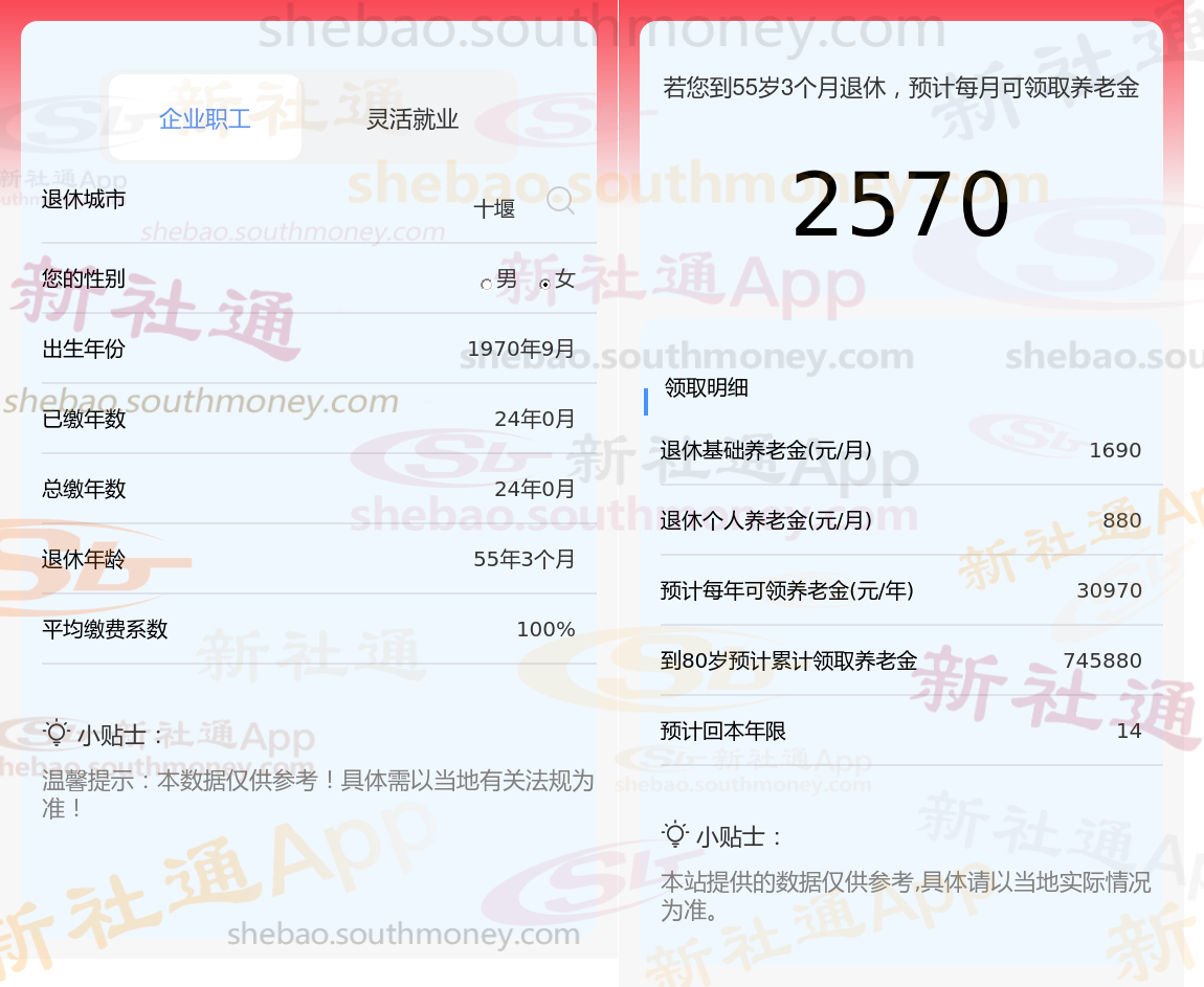 退休城市:十堰,性别:女,出生年份:1970,总缴年数24年,缴费档次:100%,新社通app养老金计算器所得:
