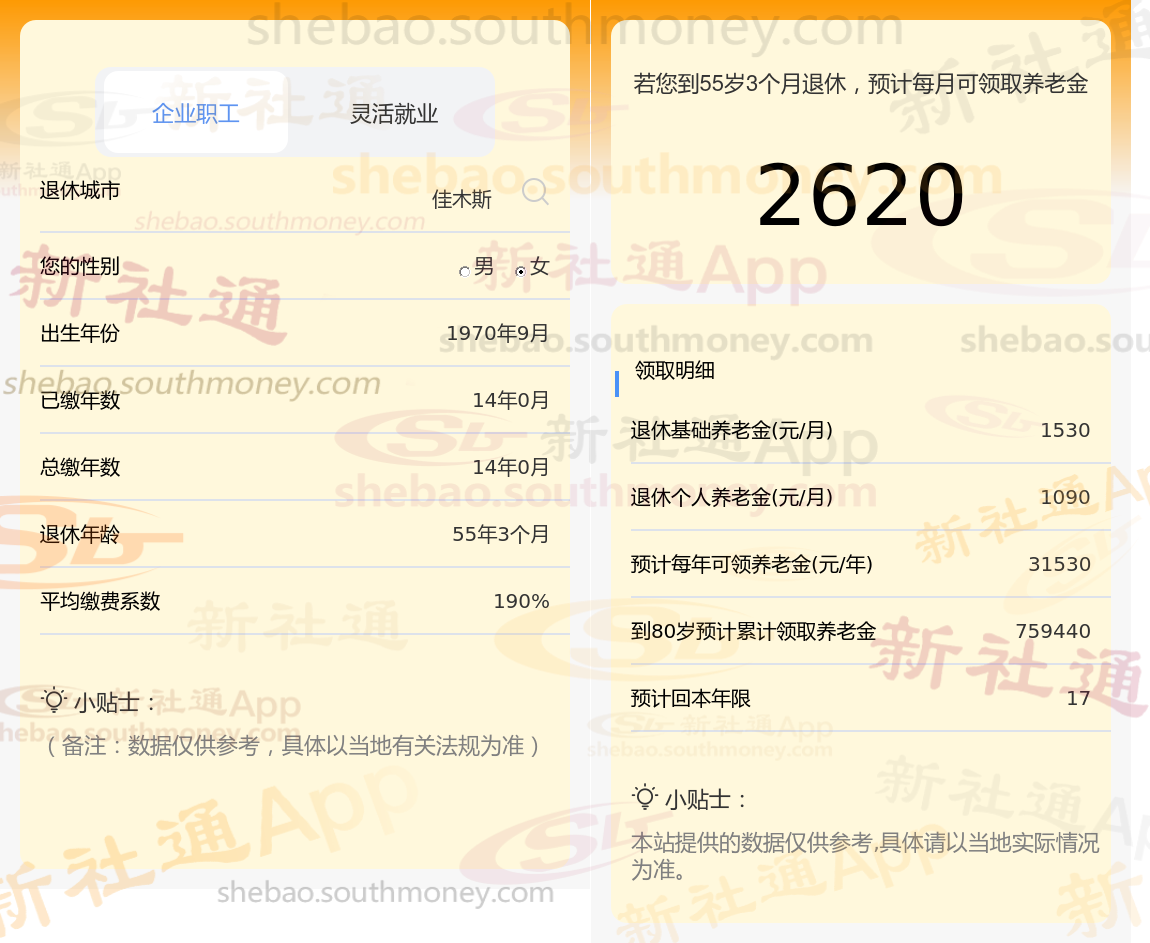 退休城市:佳木斯,性别:女,出生年份:1970,总缴年数14年,缴费档次:190%,新社通app养老金计算器所得: