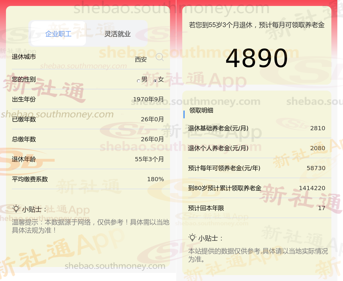 亲戚刘某退休城市在陕西西安,性别:女,出生年份:1970,总缴年数26年,缴费档次:180%,新社通app养老金计算器所得: