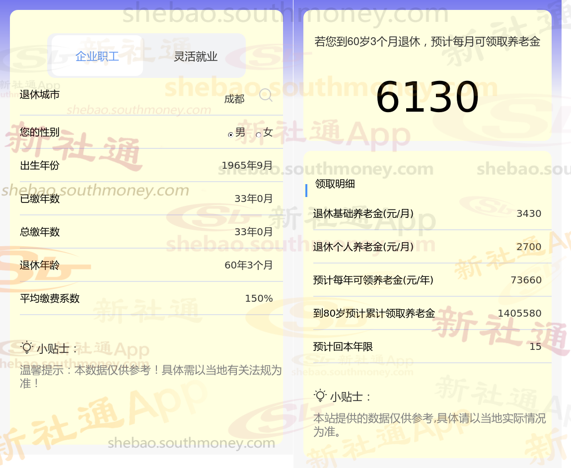 退休城市:成都,性别:男,出生年份:1965,总缴年数33年,缴费档次:150%,新社通app养老金计算器所得: