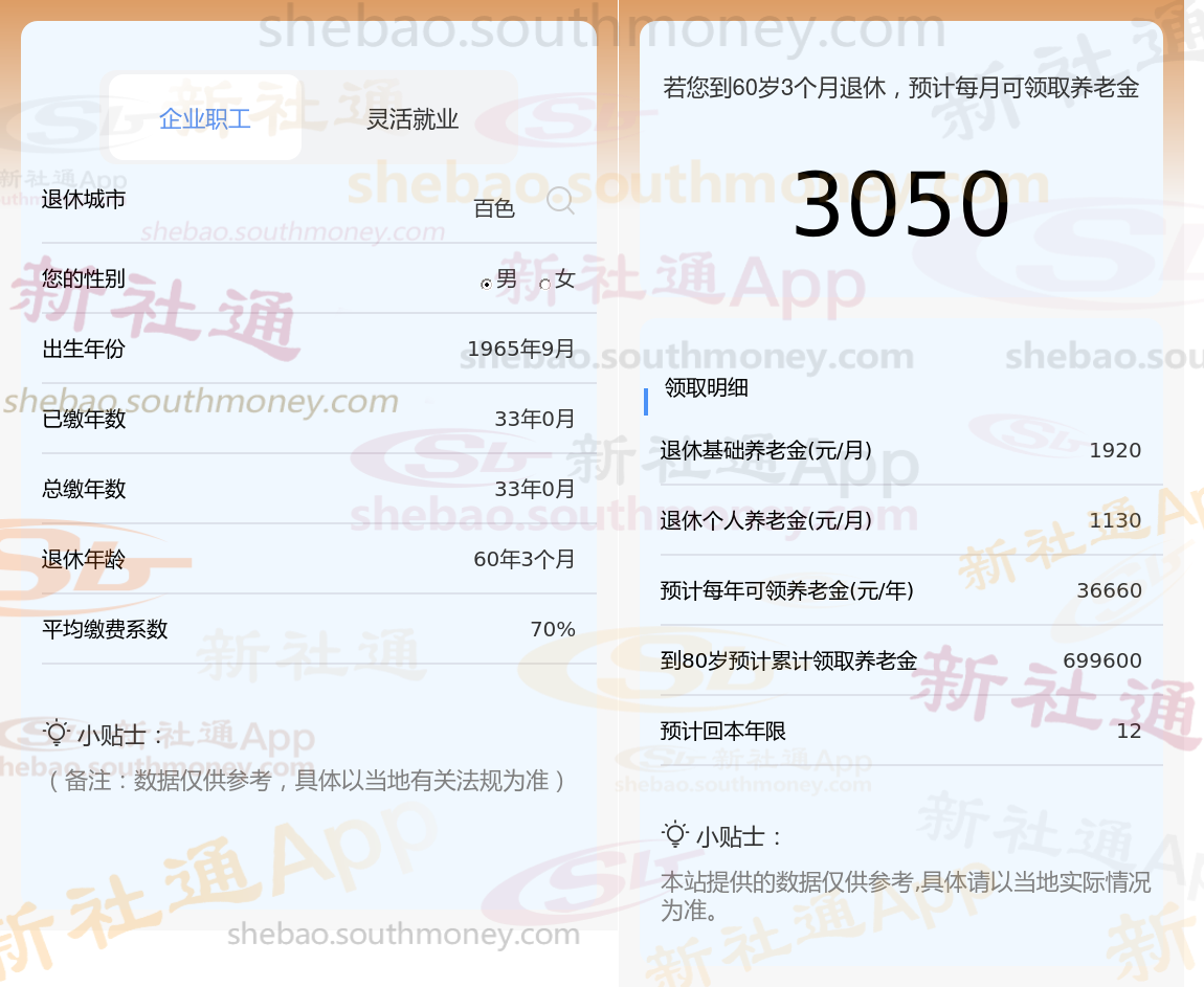 一名广西百色男性退休人员的概况:他出生于1965年,作为职工已缴纳社保满33年,且缴费档次达到70%。