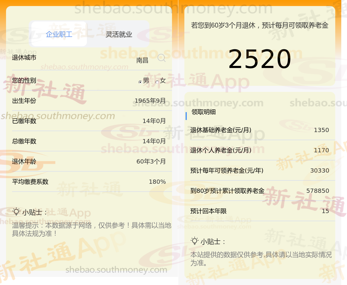 退休城市:南昌,性别:男,出生年份:1965,总缴年数14年,缴费档次:180%,新社通app养老金计算器所得: