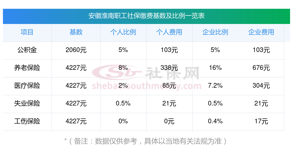 2025年安徽淮南社保缴费价格,2025年安徽淮南社保缴费多少钱?下表是2025年安徽淮南社保费用明细参考,新社通app-社保缴费查询工具提供的最新数据如下: