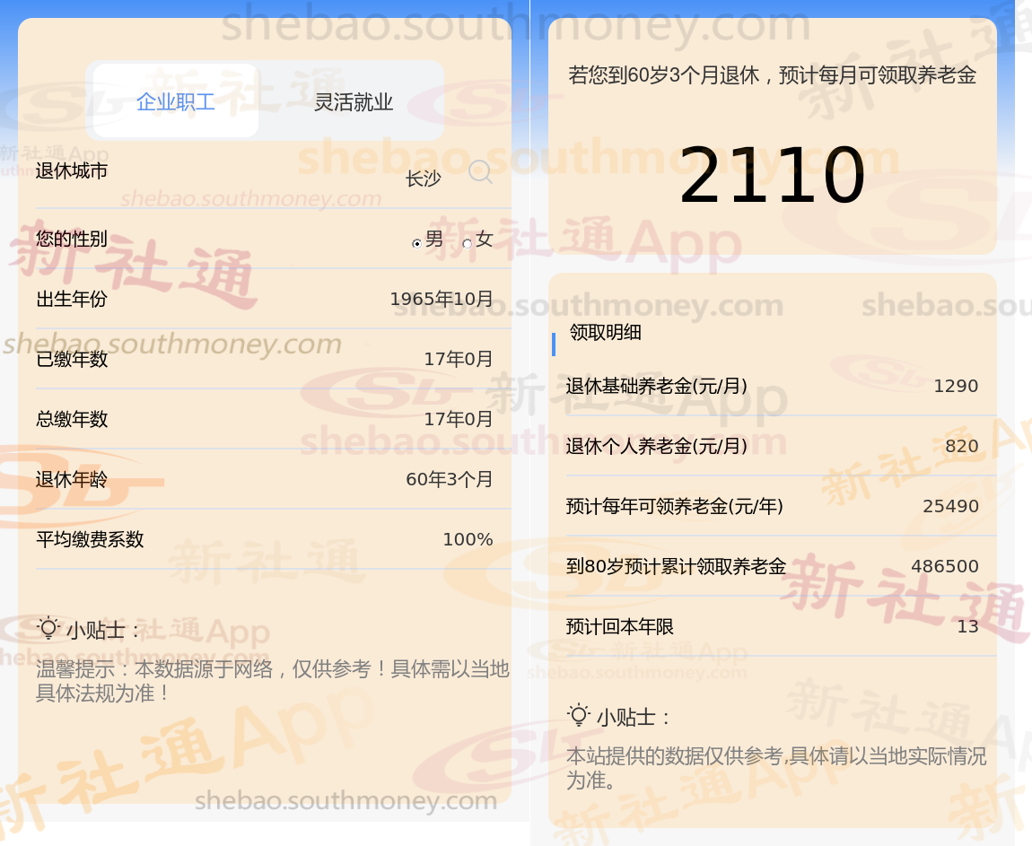 退休城市:湖南长沙,性别:男,出生年份:1965,总缴年数17年,缴费档次:100%,新社通app养老金计算器所得: