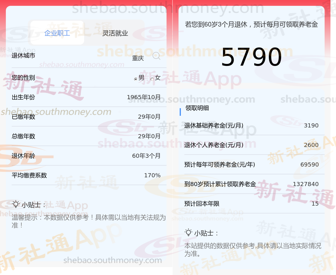 张某,重庆人,1965年出生,是一名拥有29载社保缴费年限的退休男性,缴费档次稳定在170%。岁月流转,他终于迎来了自己的退休时光。借助新社通app养老金在线计算器计算所得: