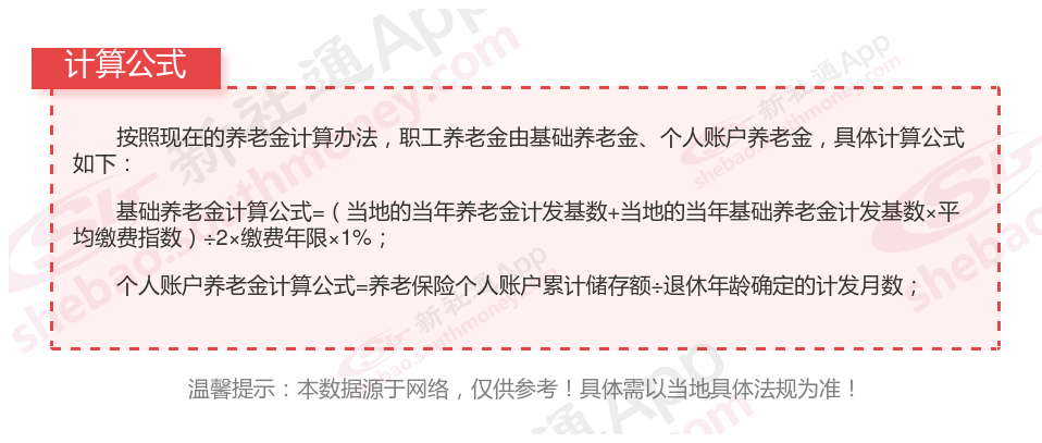 基础养老金=(参保人员退休时当地上年度在岗职工月平均工资+本人指数化月平均缴费工资)÷2×缴费年限×1%。