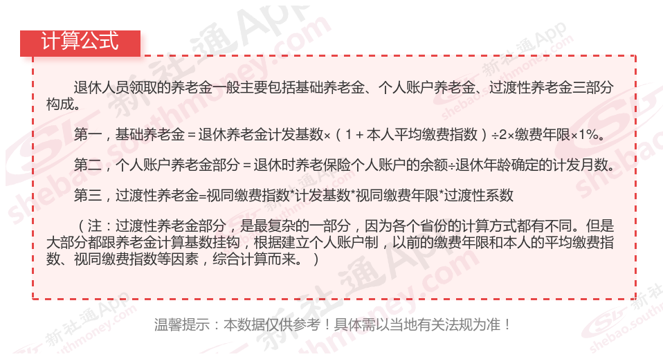 过渡性养老金(部分地区有):以本人指数化月平均缴费工资为基数,“统账结合”前的缴费年限每满1年发给一定比例。计算公式根据当地法规确定,例如过渡性养老金=本人指数化月平均缴费工资×统账结合前的缴费年限×一定比例(如1.2%或1.4%)。