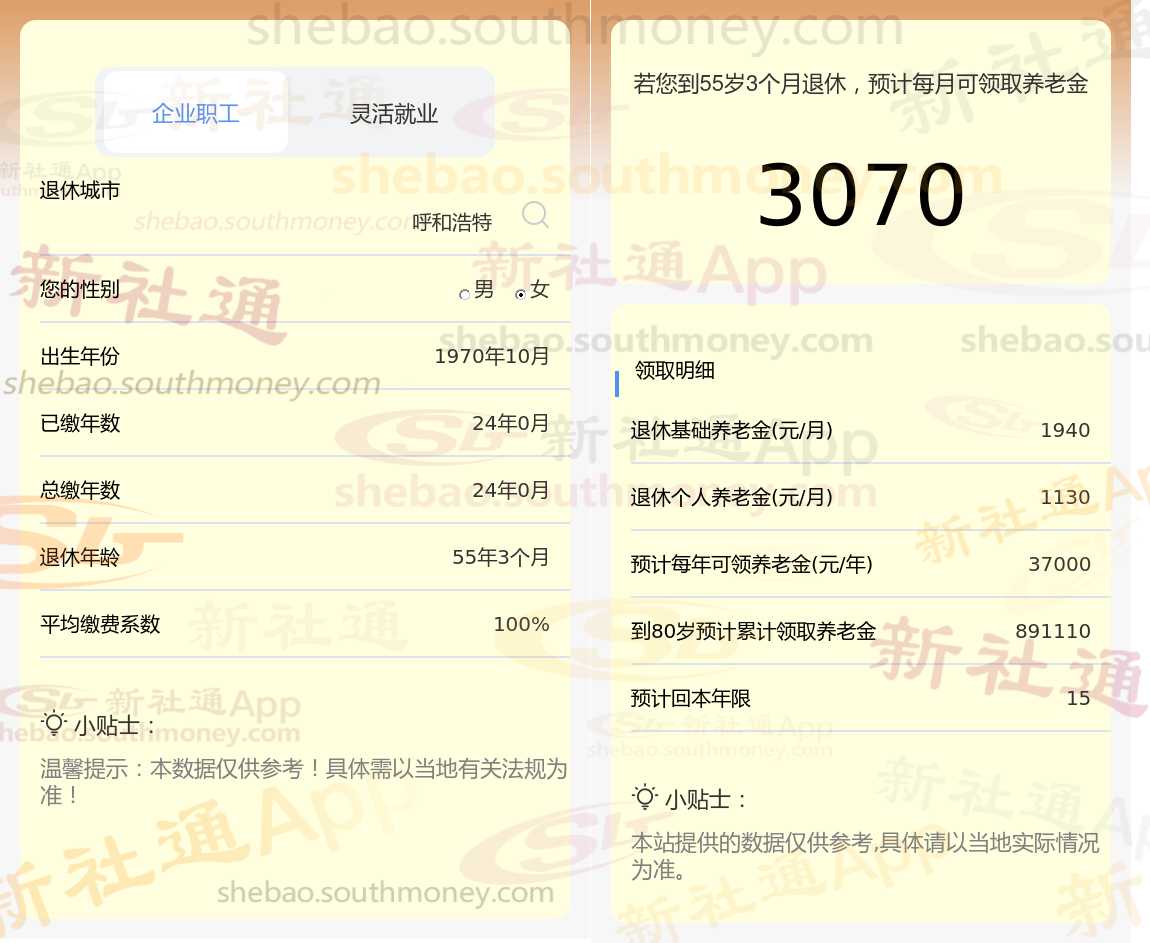 个人详情:女性,1970年出生,呼和浩特地区退休,累计缴费24年,缴费比例为100%。