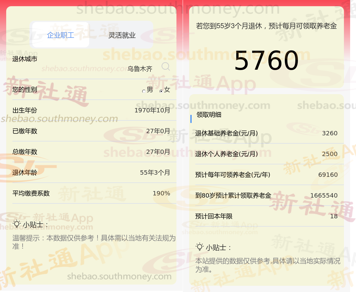 退休城市:新疆乌鲁木齐,性别:女,出生年份:1970,总缴年数27年,缴费档次:190%,新社通app养老金计算器所得: