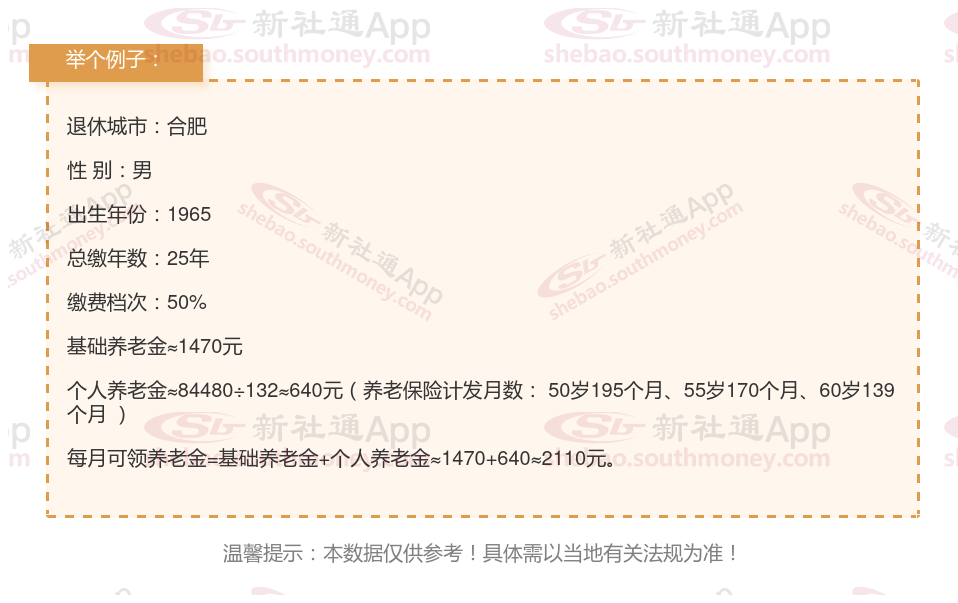 亲戚杨某退休城市在合肥,性别:男,出生年份:1965,总缴年数25年,缴费档次:50%