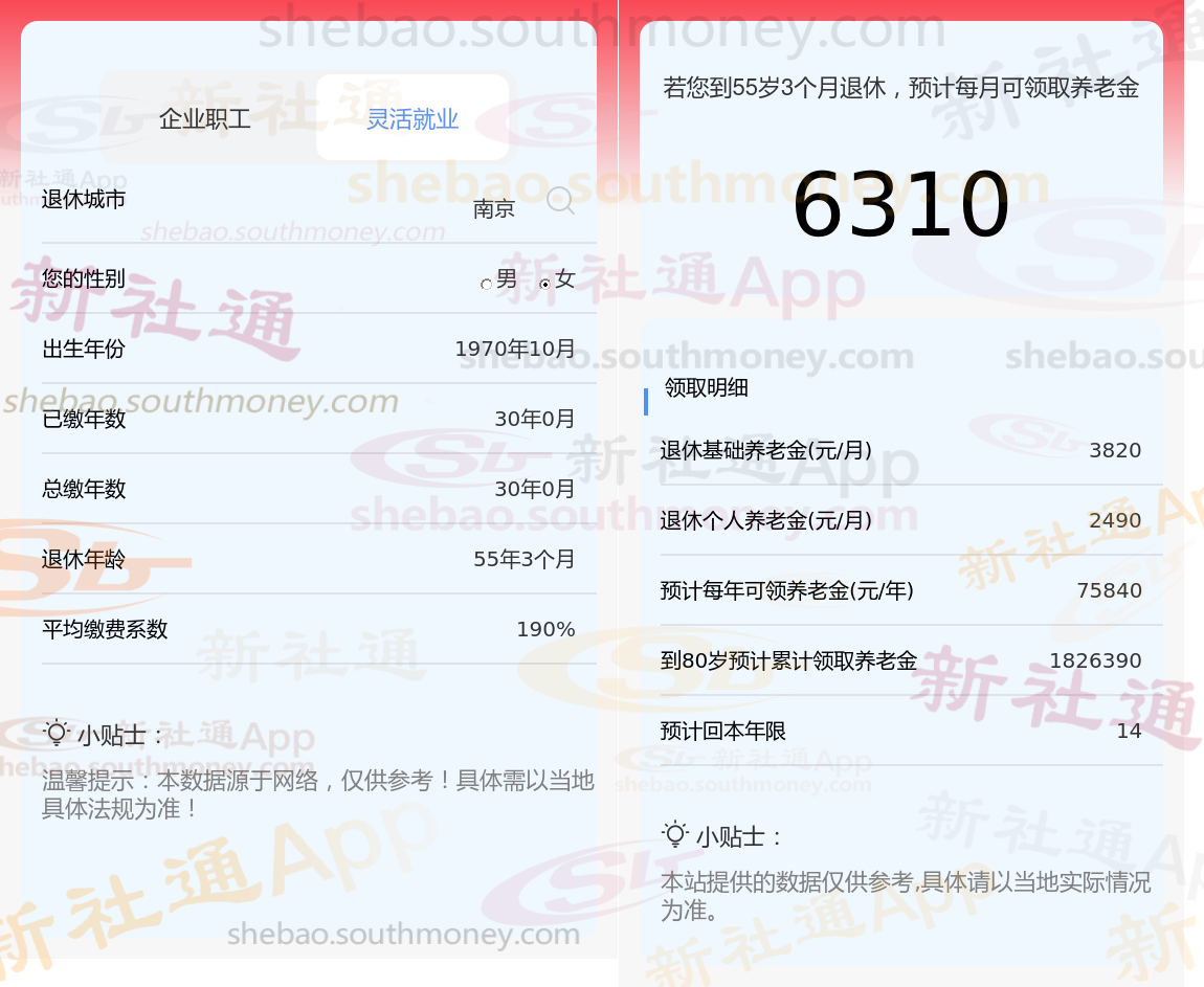 退休城市:南京,性别:女,出生年份:1970,总缴年数30年,缴费档次:190%,新社通app养老金计算器所得:
