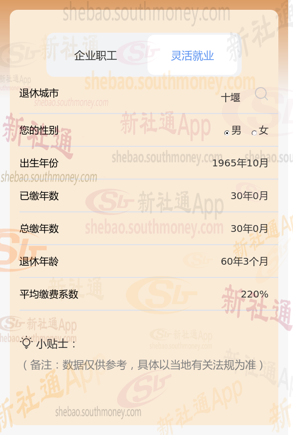 以湖北十堰1965年男性王某为例,假设其按最低标准(缴费系数0.6)缴纳社保,新社通app养老金计算器预设工资增长率等参数为3%。在此情境下,其退休后能领取的养老金数额需通过计算器精确得出,但基于上述条件,预计数额会相对较低。为获准确估算,建议王某使用计算工具按要求输入个人信息进行计算,具体数额依个人情况及当地法规而定。
