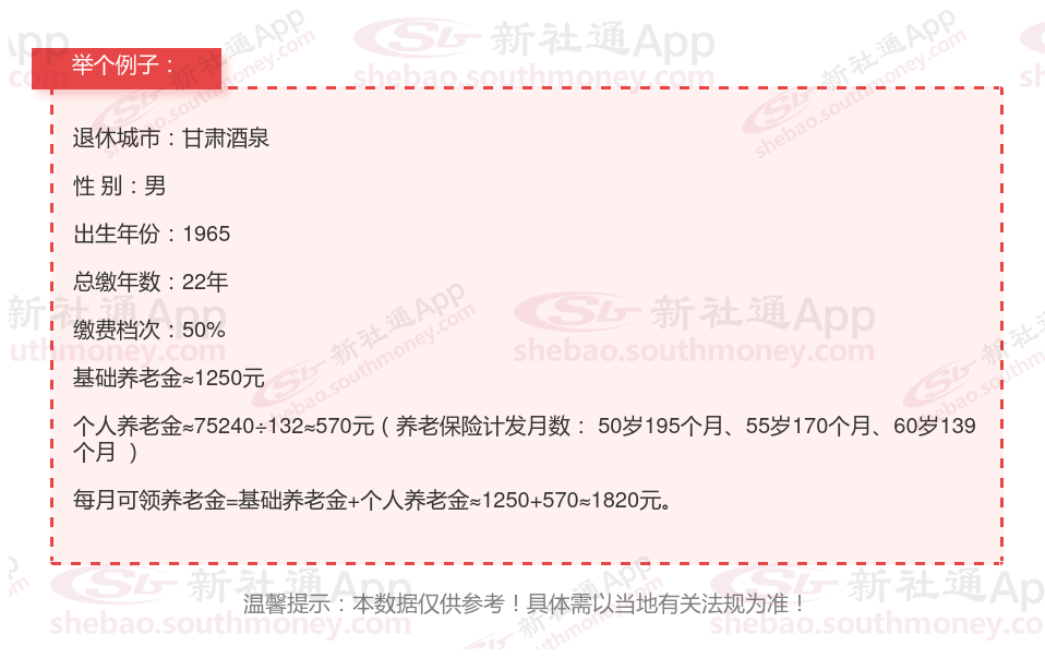 退休城市:甘肃酒泉,性别:男,出生年份:1965,总缴年数22年,缴费档次:50%